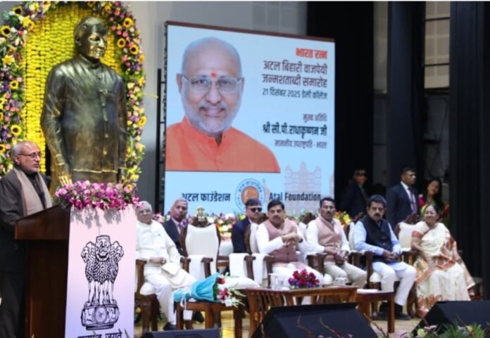 उपराष्ट्रपति श्री सी.पी. राधाकृष्णन ने कहा है कि स्व. श्री अटलजी केवल एक व्यक्ति नहीं, बल्कि एक विचार और मिशन थे। उनके कर्म, आदर्श और सुशासन की दृष्टि आने वाली पीढ़ियों के लिए मार्गदर्शक प्रकाश हैं। वे रविवार को इंदौर में आयोजित भारत रत्न स्व. श्री अटल बिहारी वाजपेयी जन्म शताब्दी समारोह को संबोधित कर रहे थे। समारोह में राज्यपाल श्री मंगुभाई पटेल ने कहा कि स्व. श्री अटल जी का जीवन ऐसे ग्रंथ की भाँति था, जिसका प्रत्येक पृष्ठ नैतिकता, उत्कृष्टता और राष्ट्रधर्म की राह दिखाता है। स्व. श्री अटल जी केवल राजनेता नहीं थे, बल्कि वे कवि, चिंतक, अद्भुत नेतृत्व गुणों से संपन्न, विनम्र, संवेदनशील और स्वाभिमानी राष्ट्रभक्त थे।